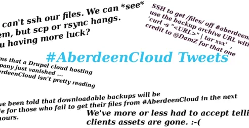 We were already prepared for a scenario like the Aberdeen Cloud breakdown, owing to our disaster recovery plan. Fortunately we didn't have to set it in motion. Each night we have a simple script which takes off-site backups of all of our hosted sites. We've made the source code available on github, so hopefully this will help others prepare for the likes of the Aberdeen Cloud implosion, and perhaps we can share ideas on how to improve each other's disaster recovery plans.